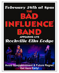 VOCATIONAL SCHOLARSHIPS: The vocational scholarship applications are due likely by the end of March, 2017. Applicants should mail a copy of their forms to the State Association AS WELL AS to my attention at our Lodge address, so that we can select The Martha Scully Memorial Vocational Scholarship Winner for 2017. THE GUNTHER & LEE WEIGEL MEDICAL SCHOOL SCHOLARSHIP: The Elks National Foundation is also offering an exclusive scholarship opportunity just for an Elk Scholar pursuing a medical degree. The Gunther & Lee Weigel Medical School Scholarships are $20,000 and offered to prior or current scholars of the Elks organization who are entering their first year of medical school. This award has been established through the generosity of the late Mr. & Mrs. Weigel. This application will be available in January. Thank you, and here's to a happy and healthy 2017 for each and every one of you! Suzanne Noonan, Committee Chair The Bad Influence Band Plays Friday, February 24thStaying at the apex of the mid-Atlantic region's competitive blues and roots music scene for a career that spans three decades isn's easy.
