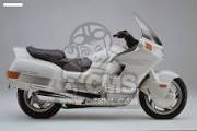 The PC800 Pacific Coast is a touring motorcycle manufactured and marketed by Honda between 1989 and 1998. Named after California's Pacific Coast Highway, over 14,000 were sold in North America, Europe and Japan, with a three-year hiatus between two production runs. The bike is noted for its single integrated trunk straddling the rear wheel, full bodywork, and distinctive two-tone paint. Like the earlier Honda Goldwing[1] and later Rune,[2] the Pacific Coast had been conceived and designed by Honda Research America specifically for the US market. Though subsequent Honda motorcycles would feature integral, side-opening trunks — namely the Deauville/NT700V, ST1100, Gold Wing and ST1300 — the wheel-straddling, top-opening trunk concept remained unique to the Pacific Coast. article, "when the PC debuted, it was considered a radical bike."[4] The PC800 departed convention with its integral trunk, extensive bodywork and marketing aimed at the "white-collar professional." "For some people, a road is more than just a strip of pavement connecting where they are with where they want to be.